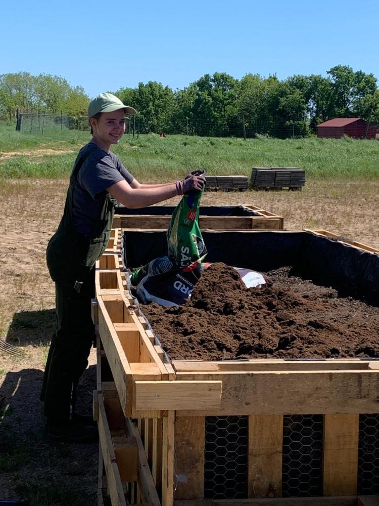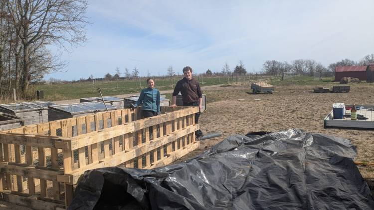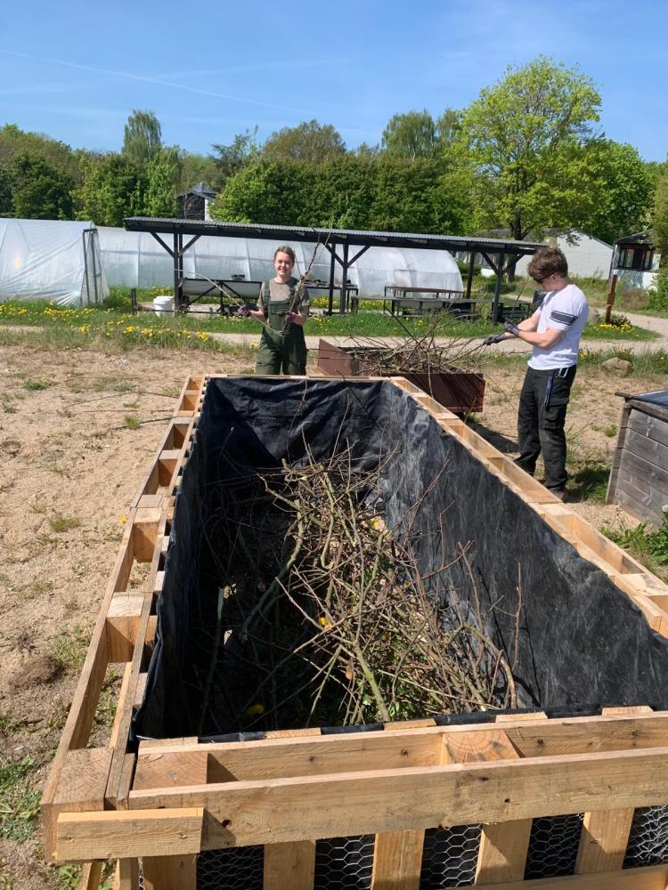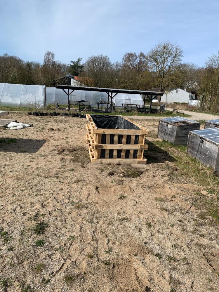 We started planning our project in March. It was important to us to build as sustainably as possible and not to buy any new materials. The raised beds are made from used disposable pallets that we were able to pick up for free at the local hardware store. We found all other materials, including the seeds, on the farm, as they had been used for projects in previous years. Since we were able to get 20 pallets from the hardware store, we based the size and number of raised beds on that amount. Fortunately, we were also able to occupy four unused raised beds, already existing on the school grounds for our project. In order to ensure a secure and level base of the beds we started to even out the ground and then embedded stone slabs for the corners. We then screwed three pallets together for the long sides of the two large beds and added one pallet on each short side to build the frame. For a little more stability and to deter rodents, we stapled rabbit wire to the inside. We then covered the inside with foil. To optimize the nutrients in the soil and the water content, we first filled the beds with a layer of branches, a layer of straw, then a thick layer of compost and finally a thin layer of potting soil.