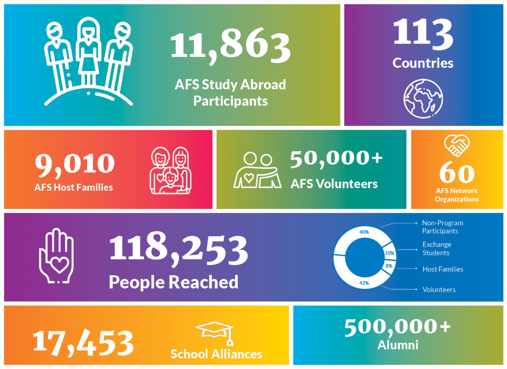 AFS Intercultural Programs is an international, voluntary, non-governmental, non-profit organization that provides intercultural learning opportunities to help people develop the knowledge, skills and understanding needed to create a more just and peaceful world.
