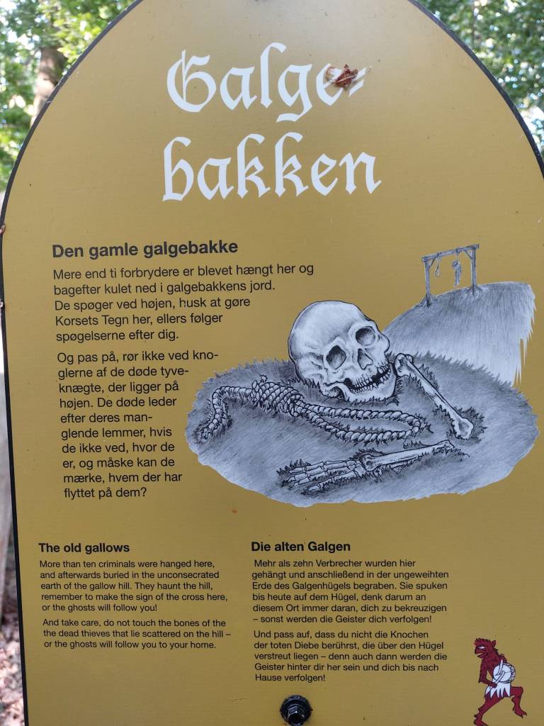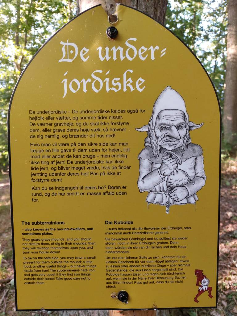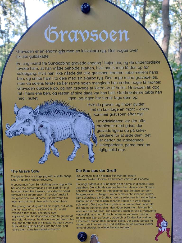 Una volta un giovane uomo di Sundkøbing scavò una fossa in questo tumulo e i Sotterranei gli promisero che avrebbe potuto tenere il tesoro a condizione che fosse riuscito ad estrarlo tutto prima dell’alba. Se non ce l’avesse fatta, la scrofa sarebbe apparsa e, correndogli tra le gambe, l’avrebbe tagliato a metà con il suo dorso affilato. L’uomo scavò con tutte le sue forze portando alla luce il tesoro, ma quando i primi raggi del sole raggiunsero la collina, gli rimanevano da estrarre ancora poche monete. Come predetto, la scrofa apparve e il giovane cercò disperatamente di uscire dalla fossa che aveva scavato. L’animale però riuscì ad afferragli una gamba; l’uomo si salvò ma rimase storpio per il resto dei suoi giorni. Tutto il tesoro ricadde nella fossa e da allora nessuno ha osato più toccarlo.