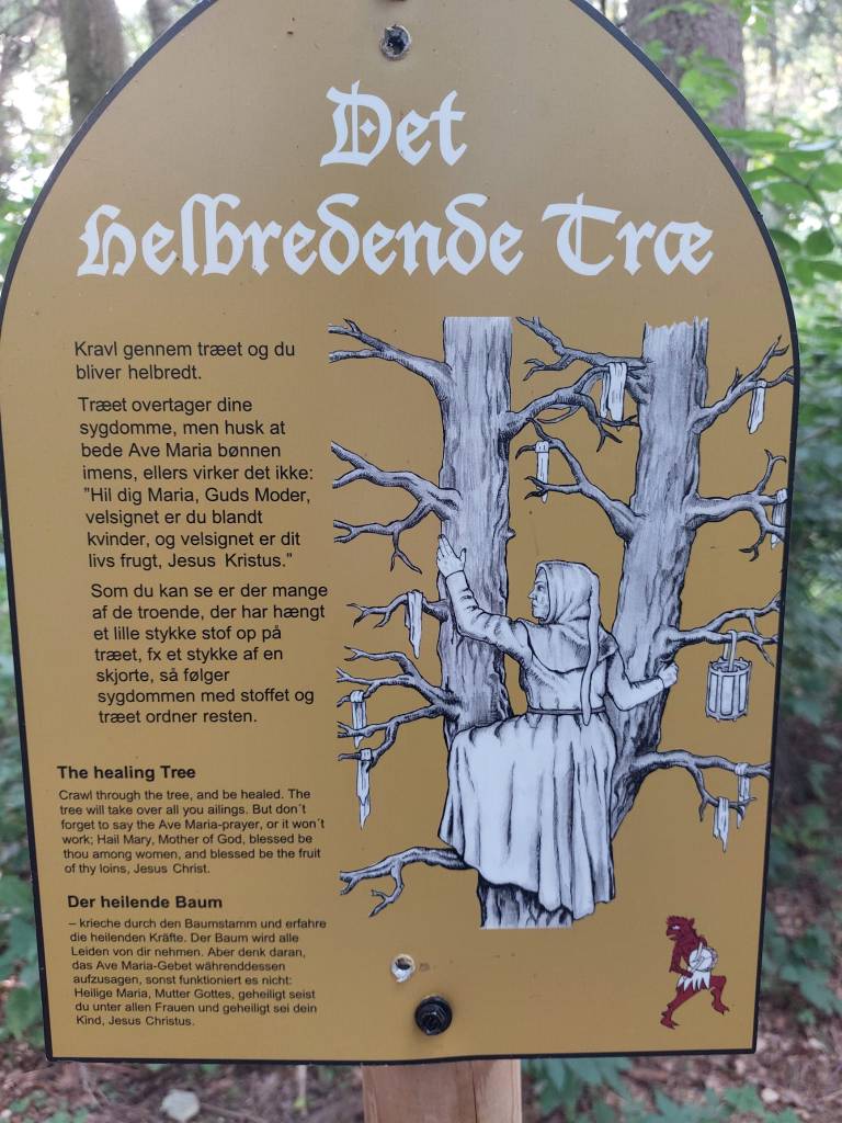 Salite sull’albero, passate attraverso i due grandi rami scendendo dalla parte opposta; in questo modo guarirete dai vostri malanni, poiché l’albero prenderà le vostre sofferenze. Ma ricordatevi di dire un’Ave Maria, altrimenti non funzionerà: “Ave Maria, Madre di Dio, tu sei benedetta fra le donne e benedetto il frutto del tuo seno, Gesù”.